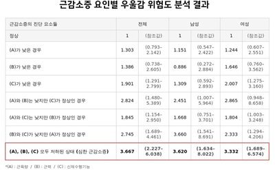 또한 근육량과 근력, 신체 기능이 모두 저하된 ‘심한 근감소증(Severe Sarcopenia)’ 단계에서는 우울감을 느낄 위험이 정상 노인에 비해 남성은 3.62배, 여성은 3.33배까지 높아지는 것으로 확인됐다.