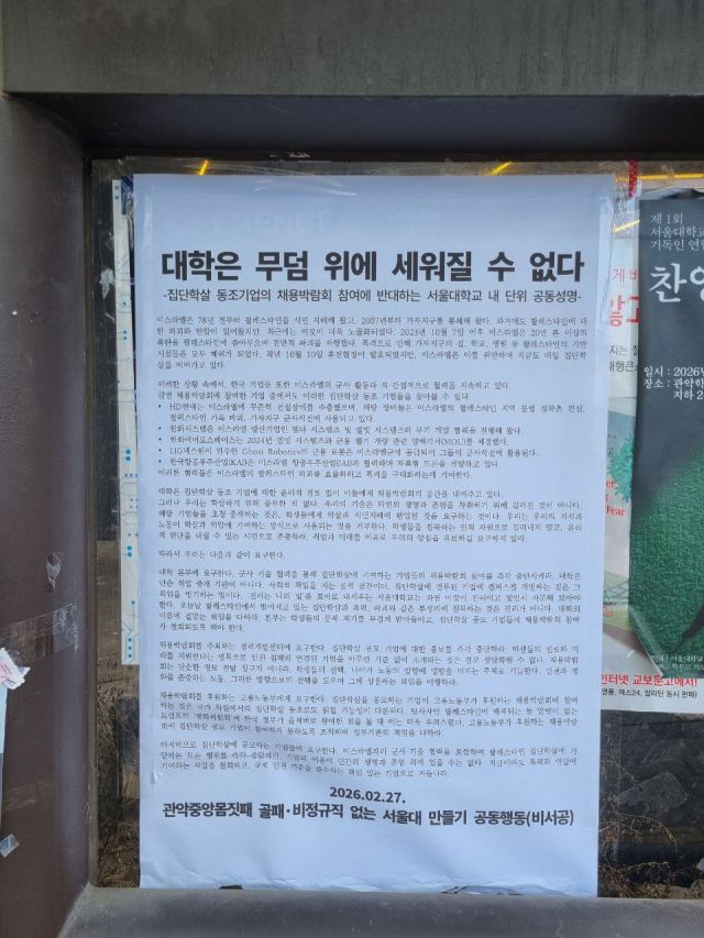 워라밸만 좋으면 되는 일이 아니다. 대학이 취업박람회에 집단학살 연루 기업을 초청하는 것은 곧 학생들이 집단학살 공범이 되도록 방조하고 장려하는 것이다. 대학은 취업 중개 기관이 아니라 사회적 책임을 가진 공적 공간이다. 대학이 할 일은 집단학살 연루 기업에 금칠해 취업박람회에 들여보내는 것이 아니라, 학생들에게 그 실체에 대해 직시하게 하는 일이다.