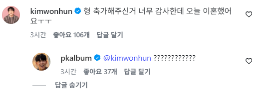 그러나 김원훈은 해당 게시글에 댓글로 “형 축가해주신 거 너무 감사한데 오늘 이혼했다”고 남겼고, 폴킴은 “???”라며 혼란스러움을 드러냈다. 그만큼 두 사람의 결혼식은 만우절 이벤트가 아닌 ‘하이퍼 리얼리즘’을 자랑했다.