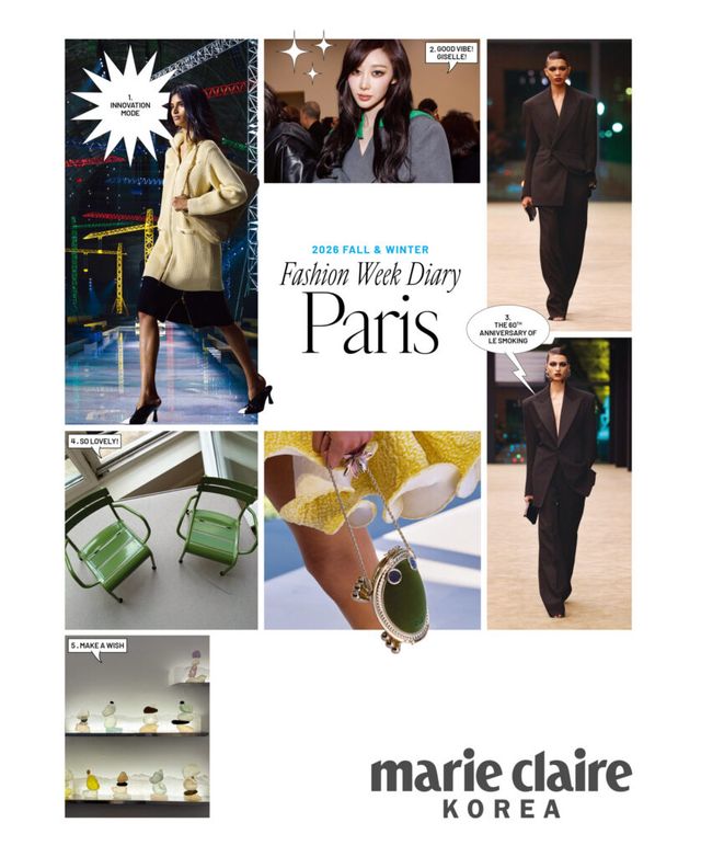 2 GOOD VIBE! GISELLE! 로에베 2026 F/W 컬렉션을 보기 위해 파리로 향하는 비행기 안에서부터 쇼장의 모든 순간을 마리끌레르 카메라와 함께 기록한 브랜드 앰배서더 지젤. 짧은 일정 탓에 피곤할 법도 한데 시종일관 밝고 적극적인 모습을 보인 그 덕분에 긍정적인 에너지를 참 많이도 받은 촬영이었다. 그린 컬러가 포인트인 오버사이즈 그레이 재킷과 페더 장식 레더 팬츠를 입은 지젤의 매력적인 모습. 그리고 잭 & 라자로 듀오의 새로운 로에베 컬렉션을 관람한 그의 프로페셔널한 모먼트가 궁금하다면? 마리끌레르 코리아 인스타그램에서 확인 가능하니 놓치지 말기를!