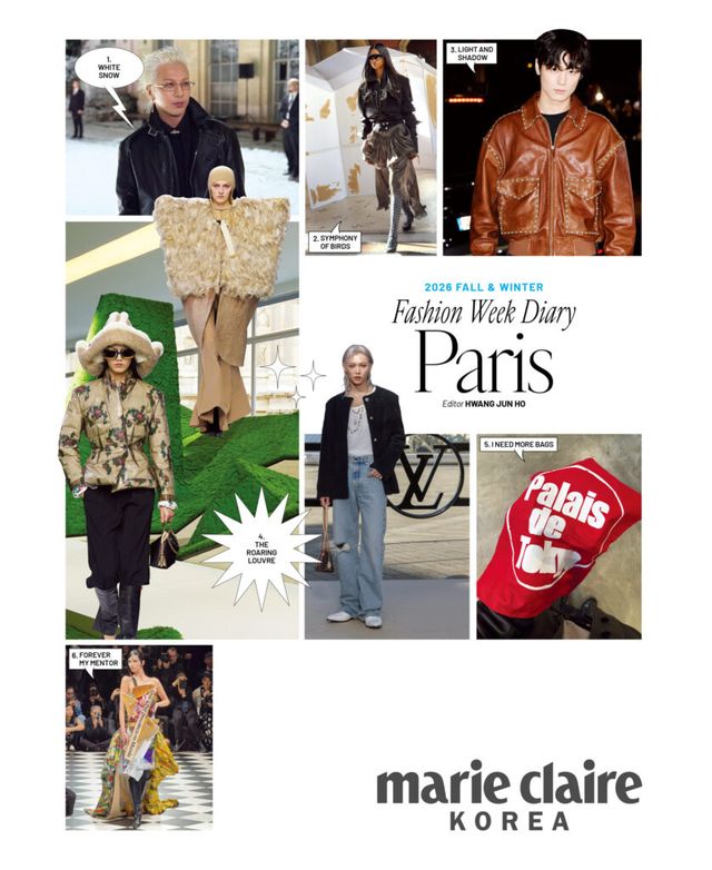 3 LIGHT AND SHADOW 발렌시아가의 새로운 시대가 도래했음을 알린 피에르파올로 피치올리의 발렌시아가 컬렉션. 영화음악의 거장 한스 짐머의 웅장한 사운드트랙이 흐르는 베뉴에서 모습을 드러낸 이번 컬렉션은 빛과 어둠의 대비에서 발견한 서사를 담았다. 어둠 속에서도 은은하게 빛나는 리벳 장식이 수놓인 브라운 레더 재킷을 입은 주연은 발렌시아가의 밤을 환하게 밝히는 듯했다. 지난해 발렌시아가와 주연이 함께했던 <마리끌레르> 스페셜 에디션을 들고 온 소녀팬을 발견한 순간, 괜히 마음이 뿌듯해지며 미소가 번졌다.
