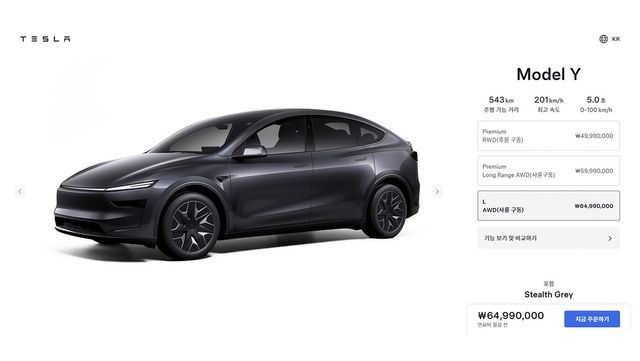테슬라 한국 홈페이지에 기재된 모델 Y L 판매 정보. / 테슬라