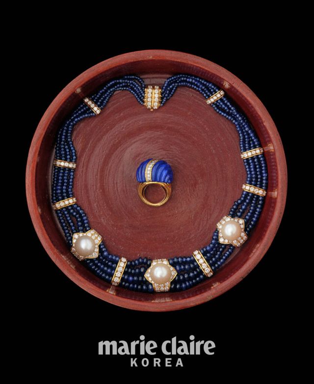 골드, 사파이어, 진주, 다이아몬드로 이루어진 1982년 프레드 헤리티지 컬렉션 네크리스, 골드, 라피스라줄리, 다이아몬드로 완성한 1970년대 프레드 헤리티지 컬렉션 링 모두