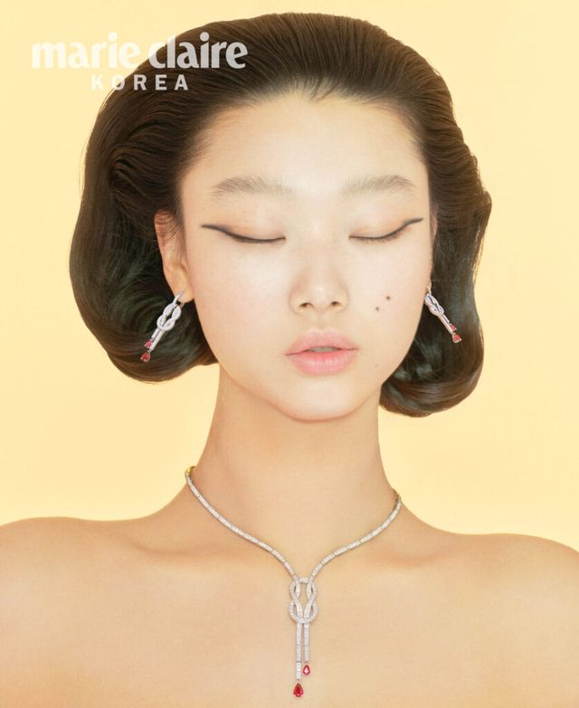 18K 화이트 골드에 다이아몬드와 각각 0.60캐럿, 0.30캐럿의 페어 컷 루비를 세팅한 샹스 인피니 셀레브레이션 루비 이어링, 18K 화이트 골드에 다이아몬드와 각각 1.00캐럿, 0.50캐럿의 페어 컷 루비를 세팅한 샹스 인피니 셀레브레이션 루비 네크리스 모두
