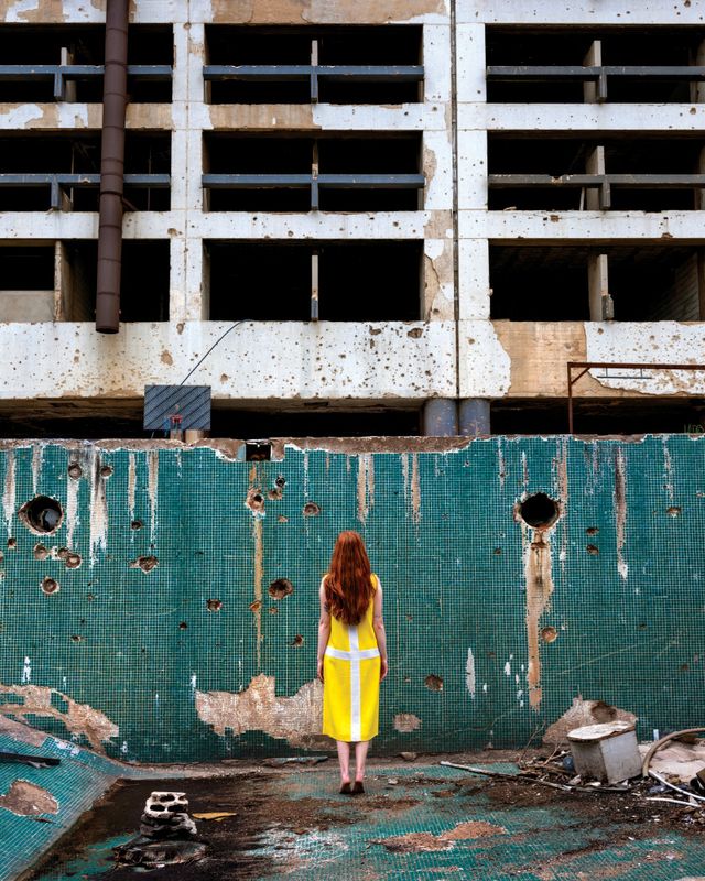 총알과 파편 자국이 남아 있는 텅 빈 수영장에 서 있는 페트라(Petra)의 초상은 내 개인적 기억과도 얽혀 있다. 내전 당시 우리 집 아파트에서 홀리데이 인 호텔이 포격당하는 장면을 지켜보곤 했다. 커튼에서 시작된 불이 도미노처럼 번져 28층짜리 건물 전체를 삼키던 장면이 아직도 기억속에 또렷히 남아 있다. 그 건물은 지금도 복원되지 않은 채 도시에 덩그러니 서 있다. 그 거대한 폐허 앞에 선 페트라는 한없이 연약하고 작아 보인다.