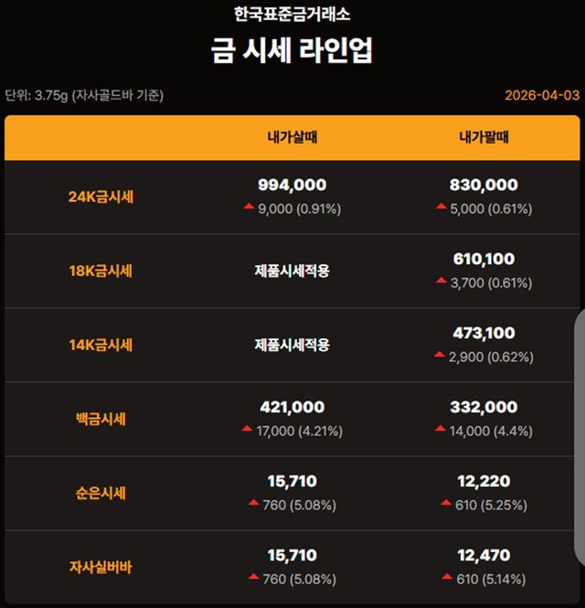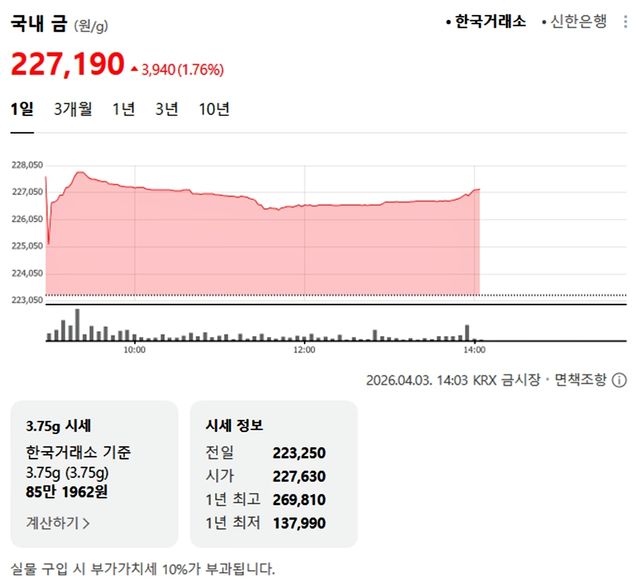 국내 금시세(금값)가 3일(한국 시각) 오후 상승세(전 거래일 대비)를 보이고 있다.