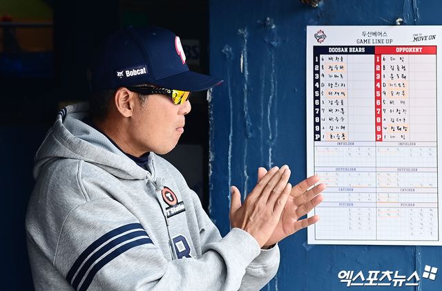 특히 지난해 정규시즌 타격왕을 차지했던 베테랑 양의지가 5경기 타율 0.050(20타수 1안타)으로 극도의 부침을 겪고 있다. 또 다른 팀의 주축 타자 박찬호(5경기 타율 0.200), 양석환(5경기 타율 0.158)도 상황이 크게 다르지 않다. 선발 타선에서 타율이 3할을 넘는 타자를 찾아보기 힘들다. 그럼에도 두산은 하위타선의 소폭 변동을 제외하고 타선에 큰 변화를 주지 않았다.