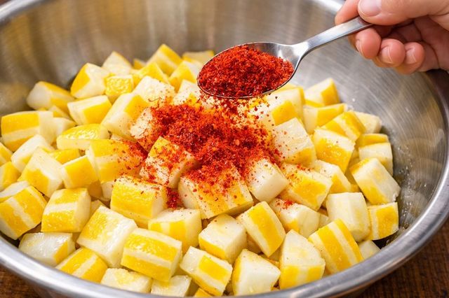참외 깍두기를 만드는 모습. 참외에 고춧가루를 뿌려 맛을 낸다. 기사 이해를 돕기 위해 AI를 활용해 제작한 자료 사진입니다. 실제 모습과 다소 차이가 있을 수 있습니다.