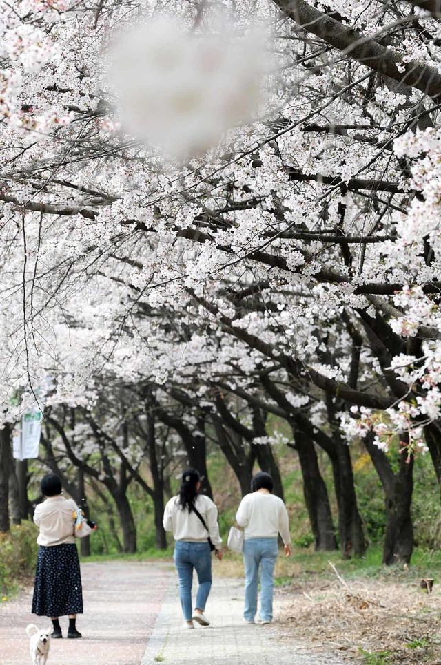 3일 전북 전주시 조경단로 일원에서 시민들이 활짝 핀 벚꽃길을 따라 걷고 있다. / 뉴스1