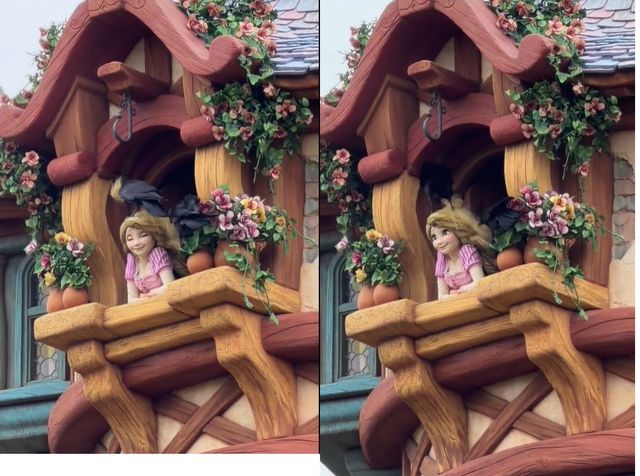 2일 뉴욕포스트에 따르면 공개된 영상에는 탑 위에서 노래를 부르는 라푼젤 조형물의 머리카락을 까마귀 두 마리가 쪼고 잡아당기는 모습이 담겼다. 긴 금발 머리를 지푸라기처럼 뜯어내는 장면이 이어지지만, 라푼젤은 반응 없이 노래를 이어가고 고개를 좌우로 움직였다.