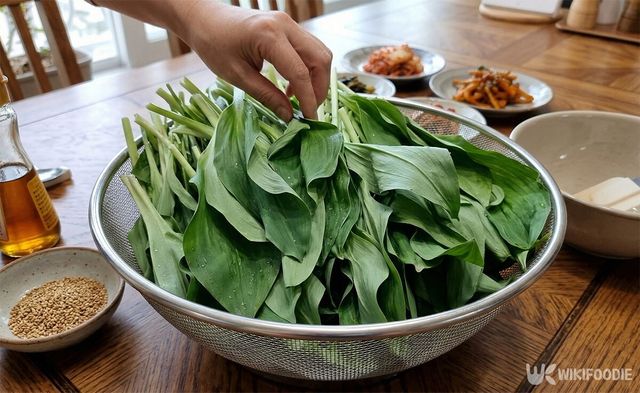 가장 먼저 해야 할 일은 명이나물을 깨끗하게 씻는 것이다. 명이나물은 잎이 넓고 줄기 사이에 흙이나 이물질이 남기 쉽다. 여러 번 물에 헹궈 이물질을 완벽히 제거하는 과정이 선행되어야 깔끔한 장아찌를 얻을 수 있다.