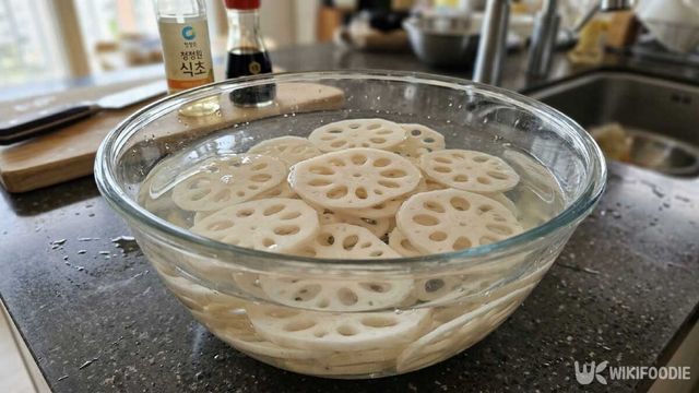 ① 연근 껍질을 벗겨 0.4cm 두께로 썬 뒤 식초물(물 3컵 + 식초 1큰술)에 10분간 담가 변색을 막는다.
