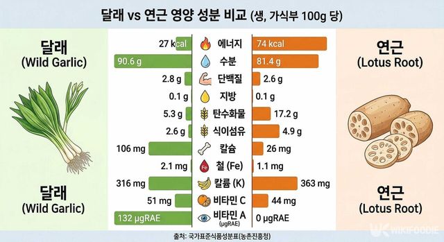 연근은 달래와 함께 먹을 때 효과가 배가되는 재료다. 식이섬유 함량이 높아 장 운동을 돕고, 비타민B군과 무기질이 풍부해 달래의 철분과 시너지를 이뤄 빈혈 예방에 도움이 된다. 탄닌 성분이 위장 점막을 보호하는 역할을 해서 소화 기능이 약한 사람에게도 부담이 적다. 전으로 조리했을 때 아삭한 식감이 살아 있어 부드러운 반죽과 대비되면서 씹는 맛이 좋다.