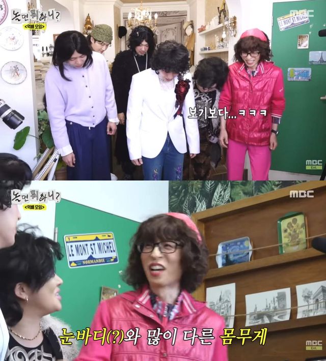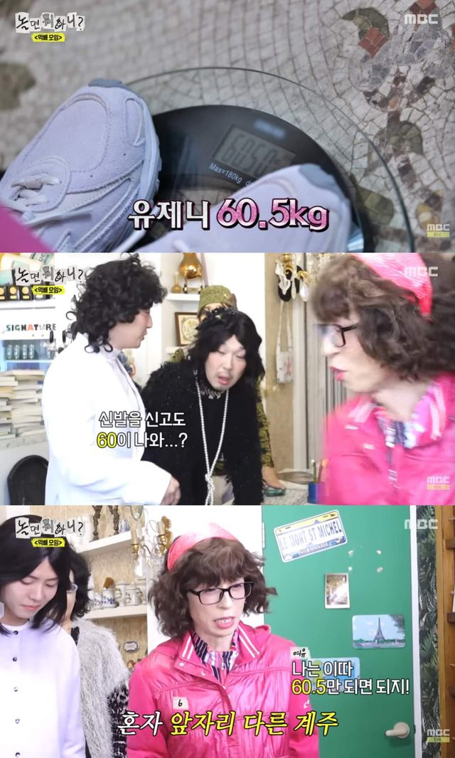 하하는 "아니, 신발을 신고도 60kg이 나와?"라며 경악했고, 랄랄 또한 "(옷을) 다 입었는데 그러냐"고 유재석을 질책했다.