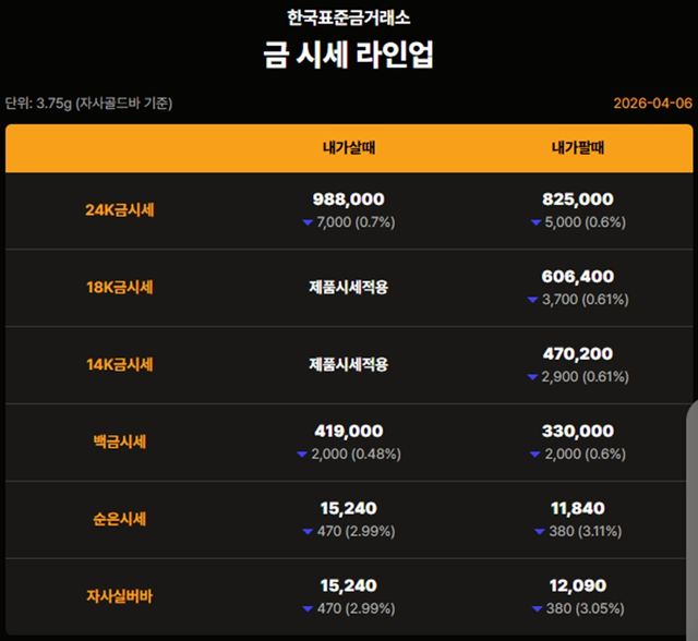 국내 금시세(금값)가 6일(한국 시각) 오후 하락세(전 거래일 대비)를 보이고 있다.