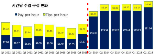 우선 최저임금 도입은 뉴욕시 배달 라이더의 수입을 큰 폭으로 올려주었다. 배달플랫폼 기업들이 DCWP에 제출한 다양한 데이터들, 그리고 그 분석자료를 뉴욕시는 분기별로 공개하고 있다. 이 데이터는 라이더의 수입이 얼마나 늘었는지 잘 보여준다.