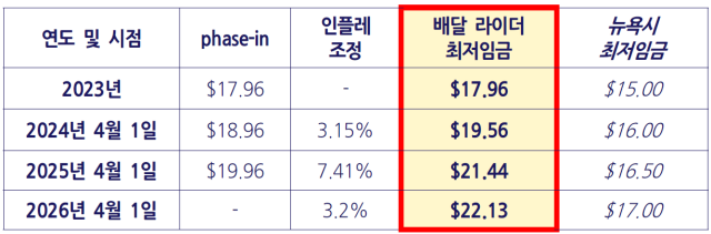 이 금액이 어느 정도인지를 이해하려면 지난 3년 간 이 수치가 어떻게 변했는지 살펴볼 필요가 있다. 우선 2023년부터 곧바로 19.96달러를 적용하지 않고 17.96달러를 적용해 2년 간 순차적으로 올렸다. 최저임금 도입 초기에 시장에 충격을 줄 수 있기에 이런 방식으로 단계적 도입(phase-in)이 이뤄졌다.