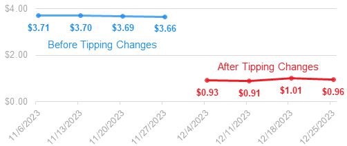 우버이츠와 도어대시가 앱 인터페이스를 변경한 것은 라이더 최저임금 제도가 시행된 2023년 12월 4일이었다. 뉴욕시 소비자·노동자 보호국(DCWP)의 공식 집계와 보고에 따르면, 12월 4일 전까지 건당 3.6~3.7달러에 달하던 팁 평균액은 설계 꼼수 도입 직후 1달러 미만으로 급락했다. 뉴욕시의 최저임금 제도에 항의하는 참으로 혁신(?)적인 꼼수였다.