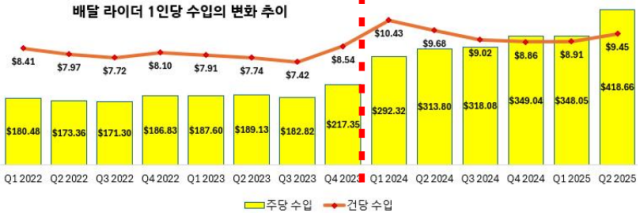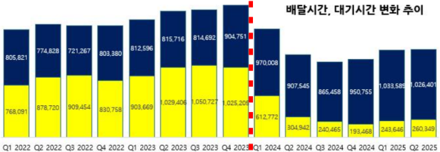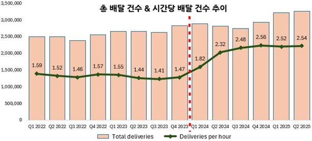 최저임금 도입 이후 한 건도 수행하지 않는 라이더 수는 급격하게 줄어들었다. 가장 최근의 데이터인 2025년 2분기의 경우 고작 2000여 명에 불과했는데, 이는 사실상 2개 이상의 앱을 켜고 일하는 라이더가 거의 사라졌음을 의미한다. 왜 이런 일이 벌어졌을까? 이유는 간단하다. 멀티앱핑을 할 이유가 없을 정도로 시간당 콜이 배정되고 있기 때문이다.