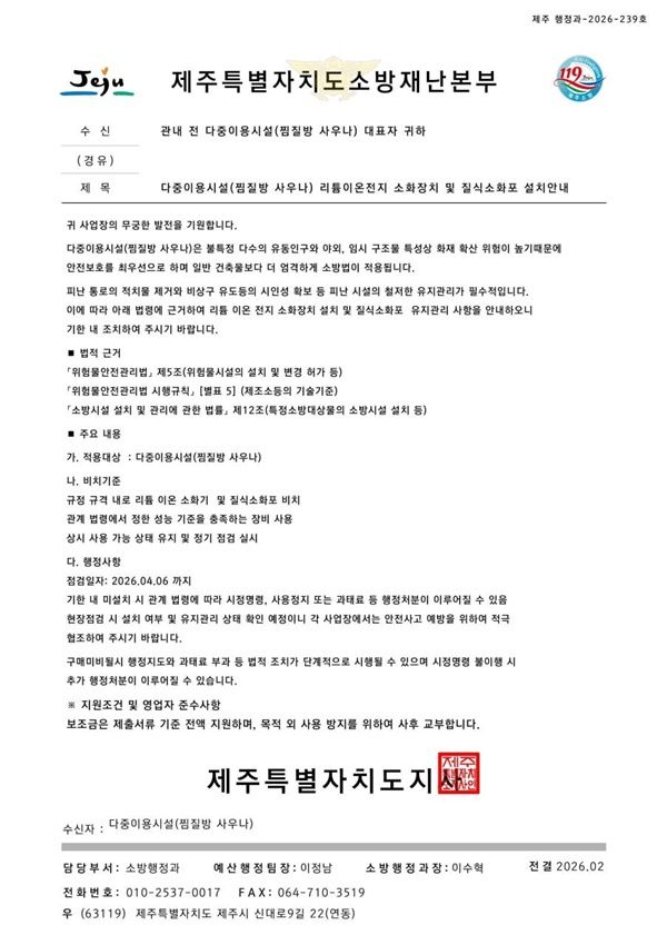 1일 제주특별자치도 소방안전본부에 따르면 최근 다중이용시설인 도내 한 찜질방 사우나에 제주소방안전본부 직원을 사칭해 '다중이용시설에 리튬이온전지 소화장치와 질식소화포를 반드시 비치해야 한다'는 내용의 전화가 걸려왔다. 이후 해당 업주에게 휴대전화 메시지로 '제주특별자치도소방재난본부'라는 이름이 적힌 공문을 받았다.
