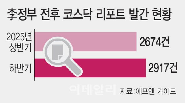 6일 금융정보업체 에프앤가이드에 따르면 이재명 정부 출범 이후인 지난해 7월부터 12월까지 증권사들이 발간한 코스닥 기업 보고서는 2917건으로 집계됐다. 지난해 상반기(2674건) 대비 9% 넘게 증가한 수준으로 반기 기준 역대 최대치다.