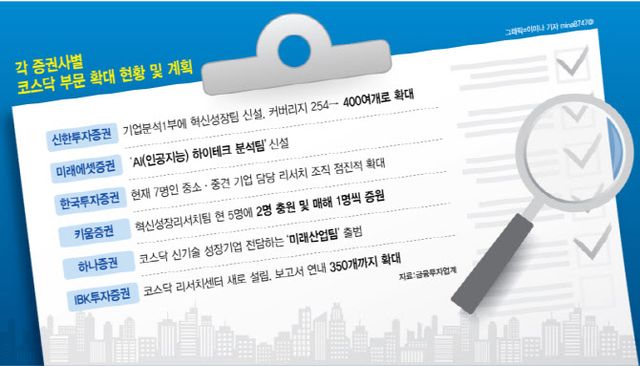 이외에도 한국투자증권은 현재 7명인 중소·중견 기업 담당 리서치 조직을 점진적으로 확대할 계획이다. 키움증권은 매달 스몰캡 전략 노트를 발간하는 5명의 혁신성장리서치팀에 2명을 올해 충원하며 이후에도 매해 1명씩 증원하기로 했다. 하나증권은 코스닥 신기술 성장기업을 전담하는 ‘미래산업팀’을 출범시켰다.