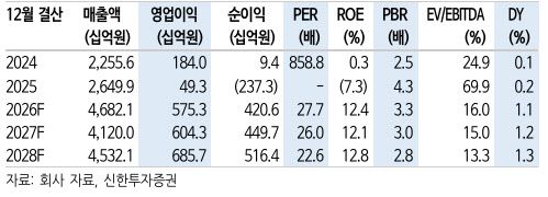 밸류에이션은 2026년 순이익 추정치 4206억원에 주가수익비율(PER) 40배를 적용했다. 기존 적용 배수(44.2배) 대비 10% 할인한 수치다. 신한투자증권은 2026년 연간 매출액 4조6821억원(+76.7%), 영업이익 5753억원(+1066.5%)으로 대폭 개선될 것으로 전망했다.