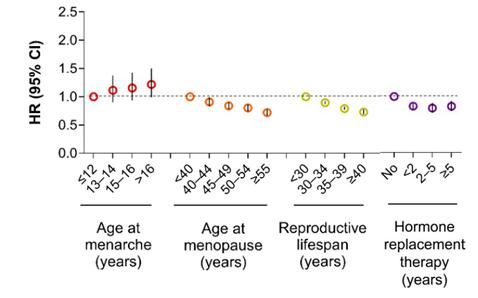 [분석 결과, 초경 연령이 빠를수록(Age at menarche), 폐경 연령이 늦을수록(Age at menopause) 치매 발생의 위험이 낮았으며 가임기간(reproductive lifespan, 초경에서 폐경까지의 기간)이 40년 이상인 여성은 30년 미만인 여성에 비해 전체 치매 위험이 27% 낮았다. 또한, 호르몬대체요법(Hormone replacement therapy)을 5년 이상 시행한 경우 사용하지 않은 경우에 비해 치매 위험이 17% 낮았다.]
