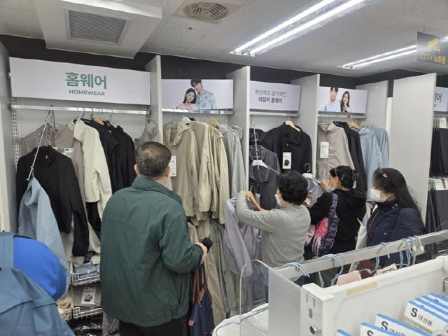 3일 오전 서울 중구 다이소 명동역점 12층. 엘리베이터 문이 열리자 잠옷을 입은 마네킹이 손님들을 맞는다. 층 전체가 의류·잡화로 채워진 패션 전용층이다. 홈웨어·이지웨어·스포츠웨어·언더웨어·잡화까지 코너마다 손님들이 상품을 살펴보는 데 여념이 없다. 남편과 함께 매장을 찾은 주부 장은경(58) 씨는 5000원짜리 스판 티셔츠를 펼쳐 들면서 “이 가격에 이런 소재면 집에서 편하게 입기 딱 좋지 않느냐”면서 “요즘 다이소 옷이 생각보다 괜찮은것 같다”고 말했다.