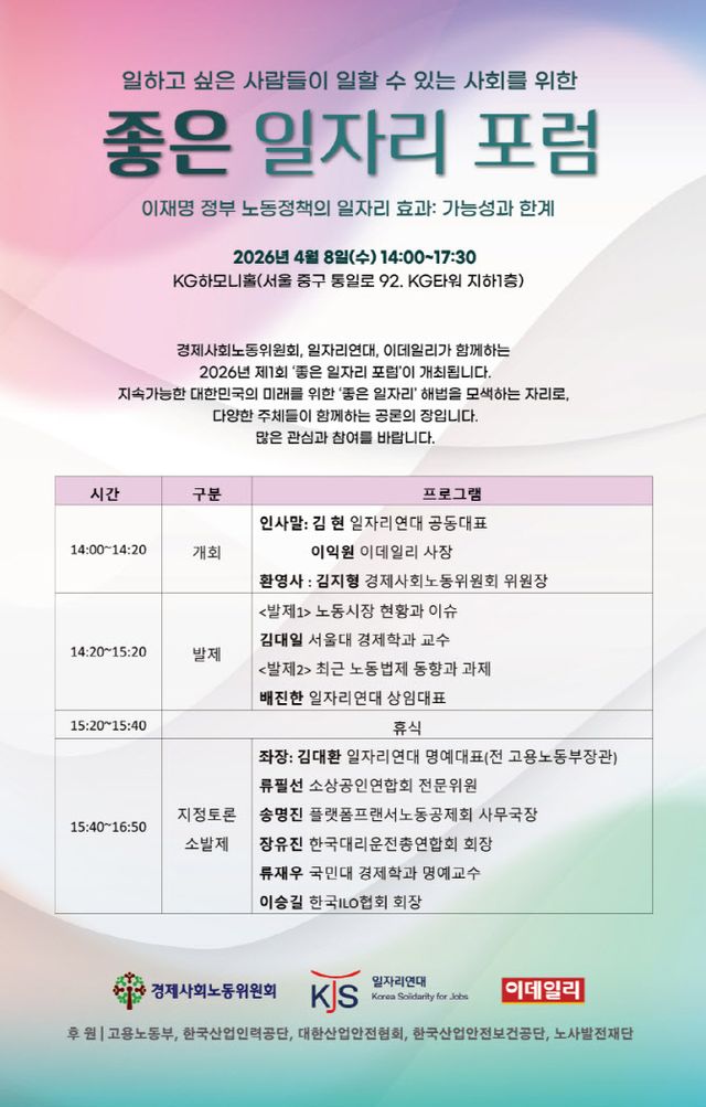 이데일리와 경제사회노동위원회, 일자리연대는 오는 8일 서울 중구 KG하모니홀에서 ‘2026년 제1회 좋은 일자리 포럼’을 개최한다. 이번 포럼은 ‘이재명 정부 노동정책의 일자리 효과: 가능성과 한계’를 주제로, 노동시장 현황과 노동법제 변화의 영향을 종합적으로 점검하는 자리다.