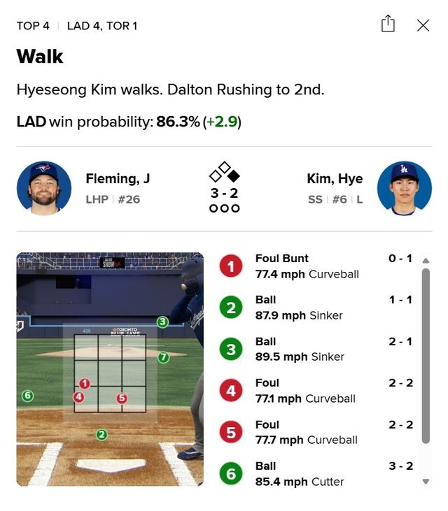 2회 첫 타석에서 뜬공으로 물러났던 김혜성은 4-1로 앞선 4회 무사 1루 두 번째 타석에서 조시 플레밍을 상대로 볼넷을 골라 출루했다. 7구까지 가는 끈질긴 승부를 펼쳤는데 스트라이크 존(1구·4구·5구)에 들어오는 공에 적극적으로 배트를 휘둘렀다. 반면 스트라이크존을 살짝 벗어난 공에는 잘 참았다.