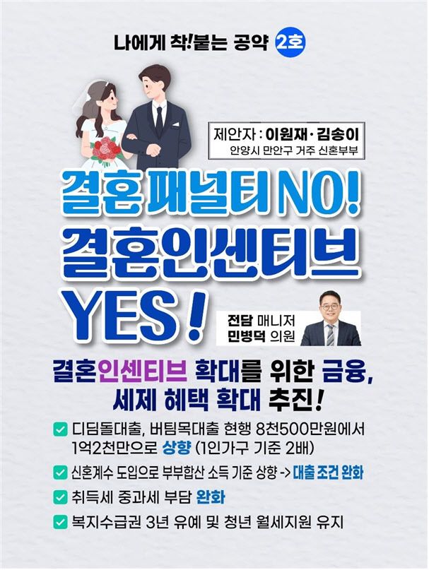 민주당은 혼인신고 시 대출 제한, 복지 탈락 등 경제적 불이익이 발생하는 ‘결혼 패널티’ 구조를 ‘결혼 인센티브’ 체제로 전환하겠다고 밝혔다.