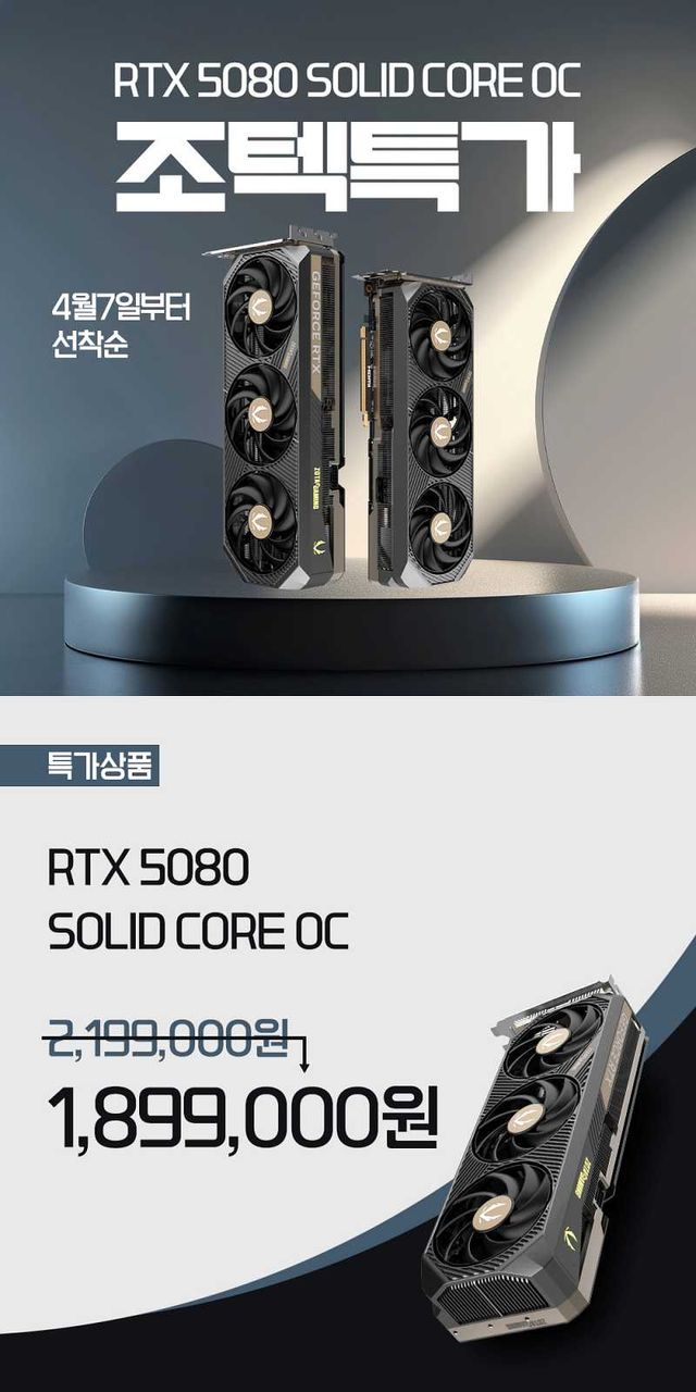 ZOTAC Korea is running a limited-time promotion for its GeForce RTX 5080 graphics card lineup. The featured model, ZOTAC GAMING GeForce RTX 5080 SOLID CORE OC, combines triple 90mm fans, a pass-through airflow design and copper heat pipes, and will be offered at a special price from April 7 to April 9 or while supplies last.