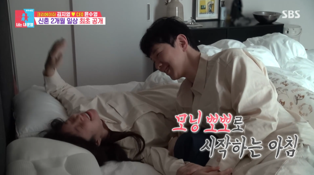 이날 모닝 뽀뽀로 하루를 시작한 김지영, 윤수영은 나란히 영양제를 복용한 후 함께 화장실에 들어갔다. 이 모습을 VCR로 지켜보던 패널들은 이유를 물었고, 김지영은 “샤워를 매번 같이한다”고 설명했다.