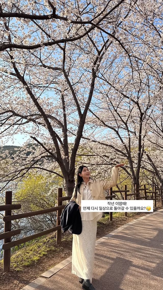 사진 속에는 지난해 벚꽃 아래서 기념사진을 남기는 영숙의 모습이 담겼다. 하루빨리 일상으로 돌아가고 싶은 영숙의 소망이 느껴지는 듯하다.