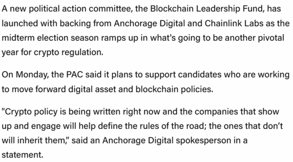 미국 디지털자산 전문 은행인 앵커리지디지털(Anchorage Digital)과 체인링크(Chainlink) 블록체인 프로젝트팀은 최근 ‘블록체인 리더십 펀드(Blockchain Leadership Fund)’라는 이름의 정치활동위원회를 설립했다. 현재 미국에서 논의 및 제정되고 있는 가상화폐 관련 법안 활동에 적극적으로 참여하겠다는 것이 앵커리지디지털의 설명이다.