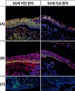 [그림] 50세 미만 환자(좌)와 50세 이상 환자(우)의 세포 형광 염색 결과.