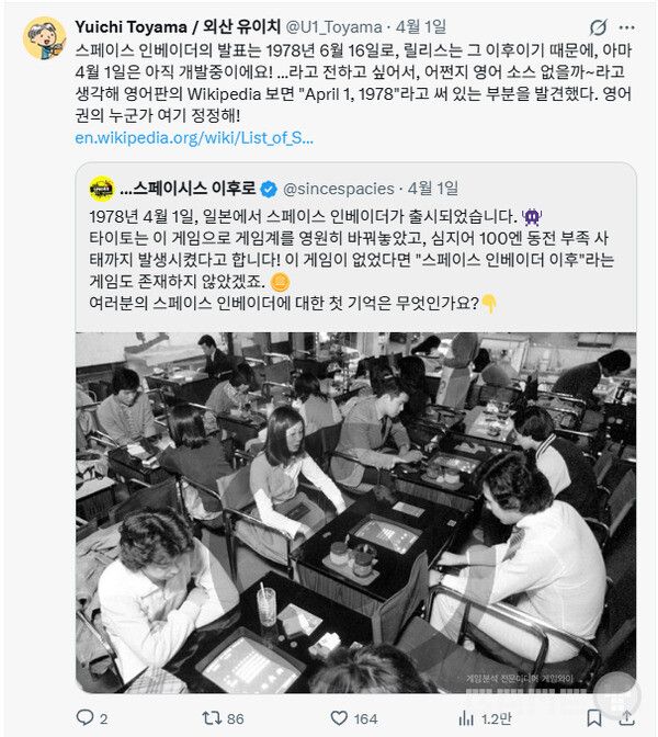 한국에서 스페이스 인베이더를 접한 시점은 정확히 1979년이다. 일본에서는 1978년 6월, 글로벌에는 같은 해 11월 출시됐고, 한국에는 1979년 들어온 것으로 확인된다. 실제 타이토 스페이스 인베이더 공식 사이트에서는 1978년 6월 16일로 기록하고 있다.