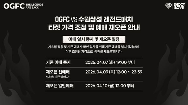 슛포러브가 주최·주관하는 OGFC와 수원 삼성의 레전드 매치 티켓 가격이 전면 조정된다.