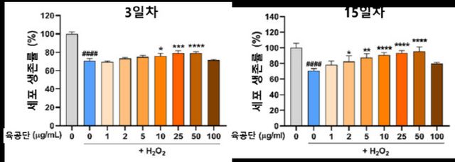 아울러 과산화수소를 투여할 때 육공단을 각각 10,25,50μg/mL 농도로 동시에 투여한 경우, 육공단 농도가 높아질수록 초록색 형광 신호가 점진적으로 회복돼, 육공단이 산화 스트레스부터 신경세포를 보호한다는 사실을 알 수 있었다.