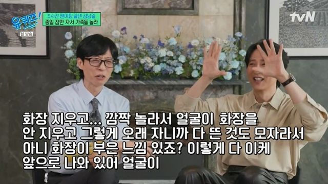 팬미팅 다음날 하루 종일 잠만 잤다는 김남길은 “어머니가 죽은 줄 알았다던데”란 말에 “뒤풀이에서 졸아본 적 처음이다. 화장도 못 지우고 잤다”라며 “화장을 안 지우고 오래 자니까 화장이 부었더라”고 토로했다. 이에 유재석은 “철이 없다. 말이 많은 게 아니라 철이 없다”고 말해 웃음을 선사했다.