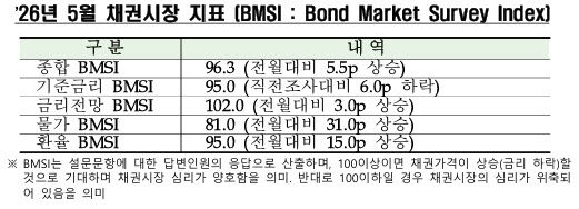 채권시장 심리를 나타내는 종합 BMSI는 96.3으로 전월(90.8)보다 5.5포인트 상승했다. 물가와 환율 상승 기대가 전월 대비 약화된 영향으로, 시장 심리가 개선된 것으로 해석된다.