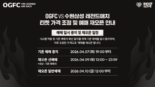 이번 가격 조정 소식은 슛포러브 공식 유튜브 채널을 통해 공개됐다. 영상에서 김동준 대표는 “티켓 오픈 이후 가격 부담으로 현장 관람이 어렵다는 의견이 많았다”며 “피드백에 공감해 가격 조정을 결정했다”고 설명했다. 이어 “양팀 레전드 선수들이 훈련과 평가전을 통해 진심을 다해 준비하고 있는 만큼 많은 팬이 경기장을 찾아 응원해 주길 바란다”고 전했다.