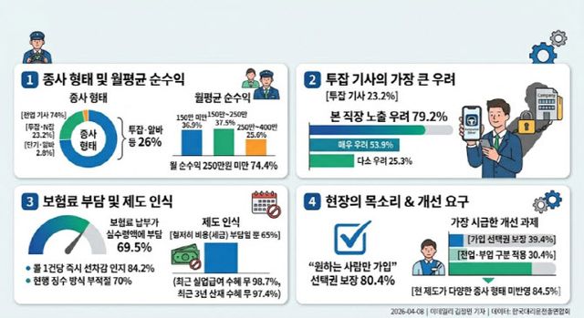 실제 조사에서도 투잡 기사들의 불안감은 컸다. 보험 의무 가입으로 인한 본 직장 노출 가능성에 대해 투잡 기사 가운데 53.9%는 “매우 우려된다”, 25.3%는 “다소 우려된다”고 답해 우려 응답이 79.2%에 달했다.