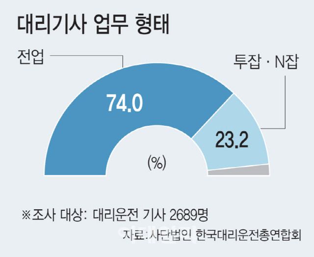8일 한국대리운전총연합회가 대리운전 기사 2689명을 대상으로 실시한 ‘대리운전산업 고용·산재 보험 실태 조사’에 따르면 응답자의 74%는 전업 기사였지만 23.2%는 투잡·N잡 형태로 대리운전을 하고 있었다. 단기·일시적 아르바이트도 2.8%였다. 대리운전이 전업 노동뿐 아니라 부업형 일자리로도 적지 않게 기능하고 있다는 뜻이다.
