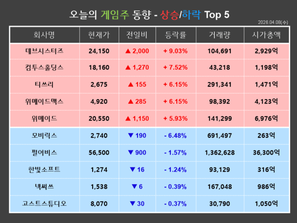 데브시스터즈가 금일(8일) 전거래일 대비 9.03%(2,000원) 상승한 24,150원에 거래를 마쳤다. 개인이 37,045주를 순매도한 반면, 기관과 외국인이 각각 17,653주, 14,185주를 순매수하며 종일 상승장을 기록했다.