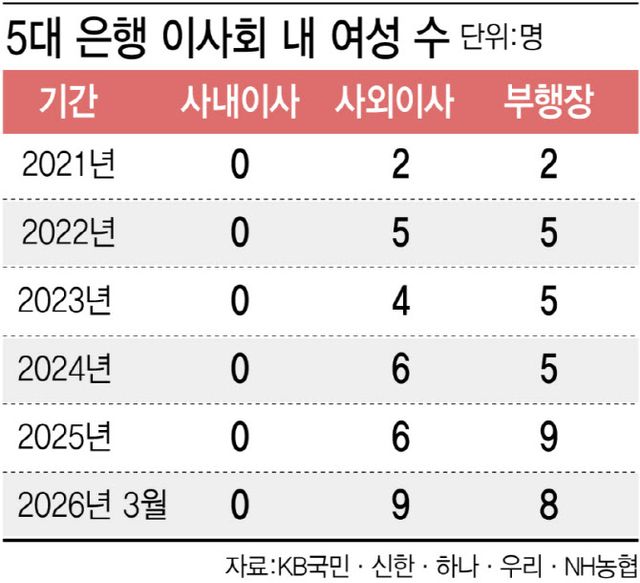 시중은행 이사회 규정을 보면 사내이사 조건은 사외이사만큼 까다롭지 않다. 법적 문제가 없고 물의를 일으키지 않았다는 전제하에 고도의 실무 경험과 높은 식견을 최우선으로 보는 정도다. 향후 사내이사가 될 가능성이 큰 부행장급 인사는 5대 은행 합산 총 82명이지만 여성은 8명에 그친다. 단순 확률상 여성 부행장이 은행장으로 승진해 사내이사로 이름을 올릴 확률은 9.7%에 그친다.