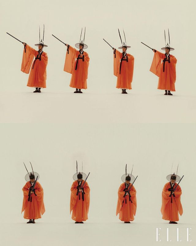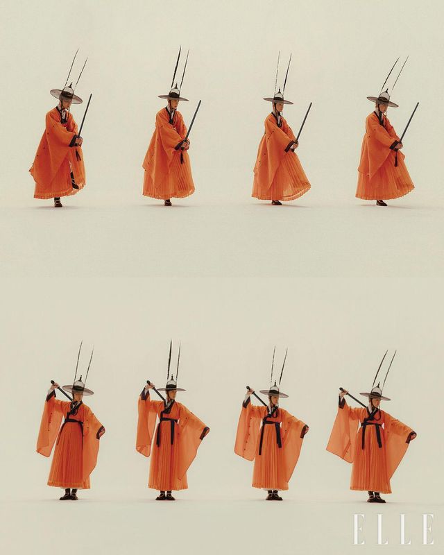 1막 일무연구 : ‘무무’ 오방색 대신 전통한복에선 흔히 사용하지 않는 서브 컬러인 주황색의 철릭을 착용해 검무의 강렬한 무드를 강조한다.