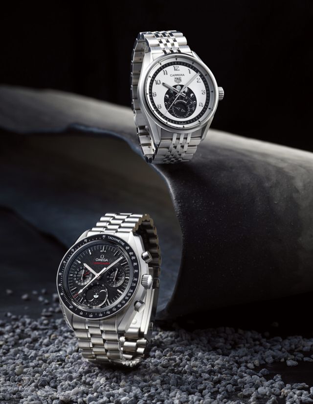TAG HEUER, 칼럼 휠 및 코-액시얼 이스케이프먼트가 장착된 수동 와인딩 크로노그래프 무브먼트 오메가 9914로 구동하는 스피드마스터 문페이즈 미티어라이트 43mm 워치