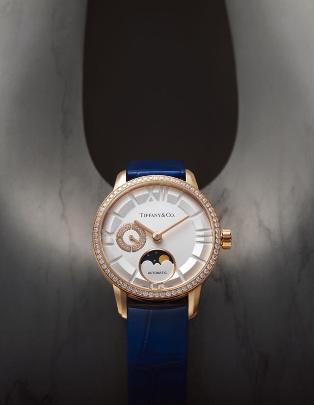 지름 34mm의 18K 로즈 골드 케이스에 라운드 브릴리언트 컷 다이아몬드를 세팅해 화려함을 배가한 아틀라스 문페이즈 워치